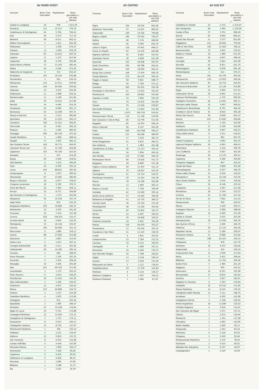 Mai un picco di questa entità in Regione Toscana. Oltre 15.000 casi in un solo giorno con il tasso di positività che supera il 20% sul totale e il 60% sui nuovi casi. Un nuovo lockdown sembra quasi inevitabile.