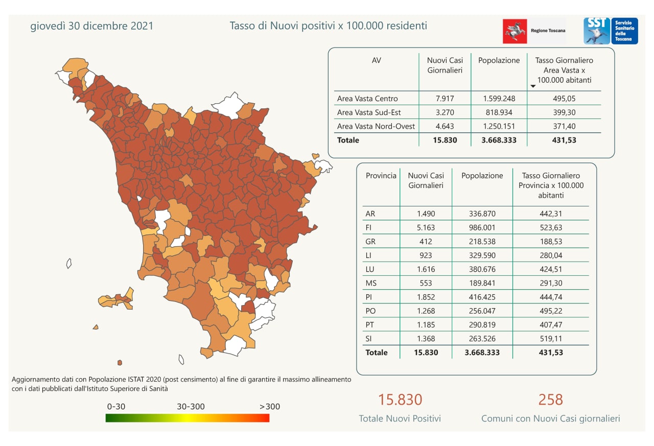 “I nuovi casi registrati in Toscana sono 15.830 su 69.759 test di cui 25.126 tamponi molecolari e 44.633 test rapidi. Il tasso dei nuovi positivi è 22,69% (69,6% sulle prime diagnosi).