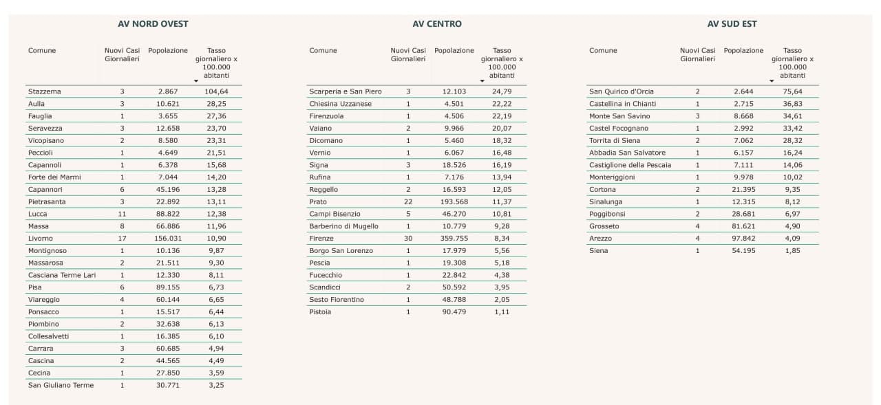 “I nuovi casi registrati in Toscana sono 191 su 4.217 test di cui 3.357 tamponi molecolari e 860 test rapidi. Il tasso dei nuovi positivi è 4,53% (9,5% sulle prime diagnosi).