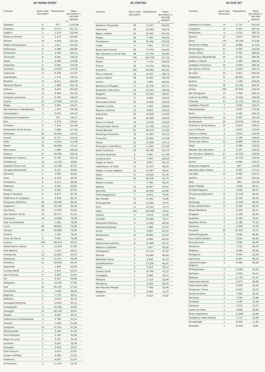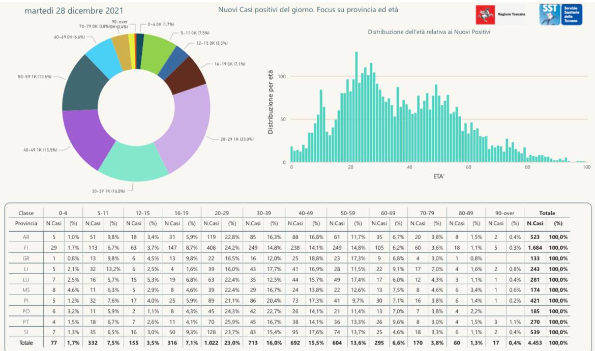 “I nuovi casi registrati in Toscana sono 4.453 su 57.458 test di cui 17.058 tamponi molecolari e 40.400 test rapidi. Il tasso dei nuovi positivi è 7,75% (44,6% sulle prime diagnosi).