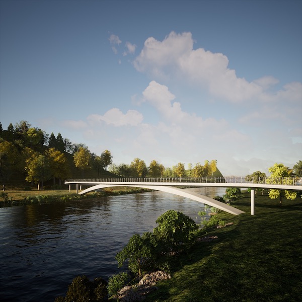 1. La passerella progettata da Simone Boccaccio, che si è classificata al primo posto. Struttura Grid-Shell in acciaio a maglia quadrangolare a nodi saldati, controventatura con funi e pannellatura in acciaio forato. Il camminamento ciclo-pedonale è inglobato nella griglia stessa e raccordato tramite travi di irrigidimento. Il design è stato concepito per creare una spettacolarità visibile solamente dal fruitore che si trova in prossimità della passerella, trasmettendo una percezione di un ambiente raccolto e organico.