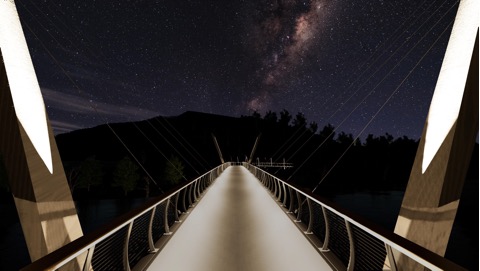 3. La passerella progettata da Lorenzo Boschi, che si è classificata al terzo posto. Passerella strallata di 70m di luce e 5,6m di larghezza. Piloni e pile sono pensati in calcestruzzo armato, mentre l’impalcato in acciaio. Sono state installate nel corrimano luci a LED per l’illuminazione del solo percorso e ridurre così l’inquinamento luminoso nel contesto naturale circostante. Valore aggiunto per l’ecosostenibilità è l’utilizzo di asfalto modificato con aggiunta di gomma da riciclo dei pneumatici fuori uso per la superficie calpestabile.