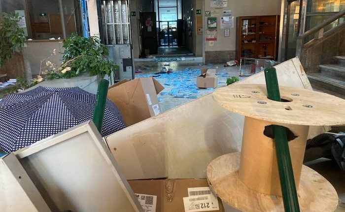 Armadi rovesciati, materiali sparsi dappertutto, barriere costruite e uno striscione lasciano pensare che sia opera di studenti per occupare l’istituto