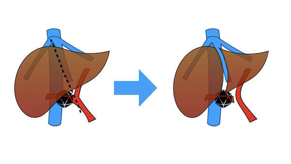 Figura 3: il primo tempo chirurgico dell’ALPPS, eseguito in ottobre, in cui viene diviso il fegato. Il fegato con il tumore rimane in sede per favorire la rigenerazione del fegato sano. Durante questo tempo vengono ricostruite anche la vena porta di sinistra e la via biliare.