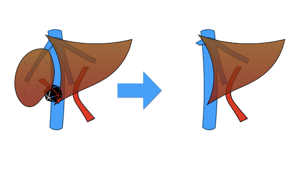 Figura 5: il secondo tempo chirurgico dell’ALPPS, eseguito 8 giorni dopo il primo tempo. Il fegato con il tumore viene rimosso per lasciare il fegato residuo già rigenerato e che ha raggiunto un volume compatibile con la vita.
