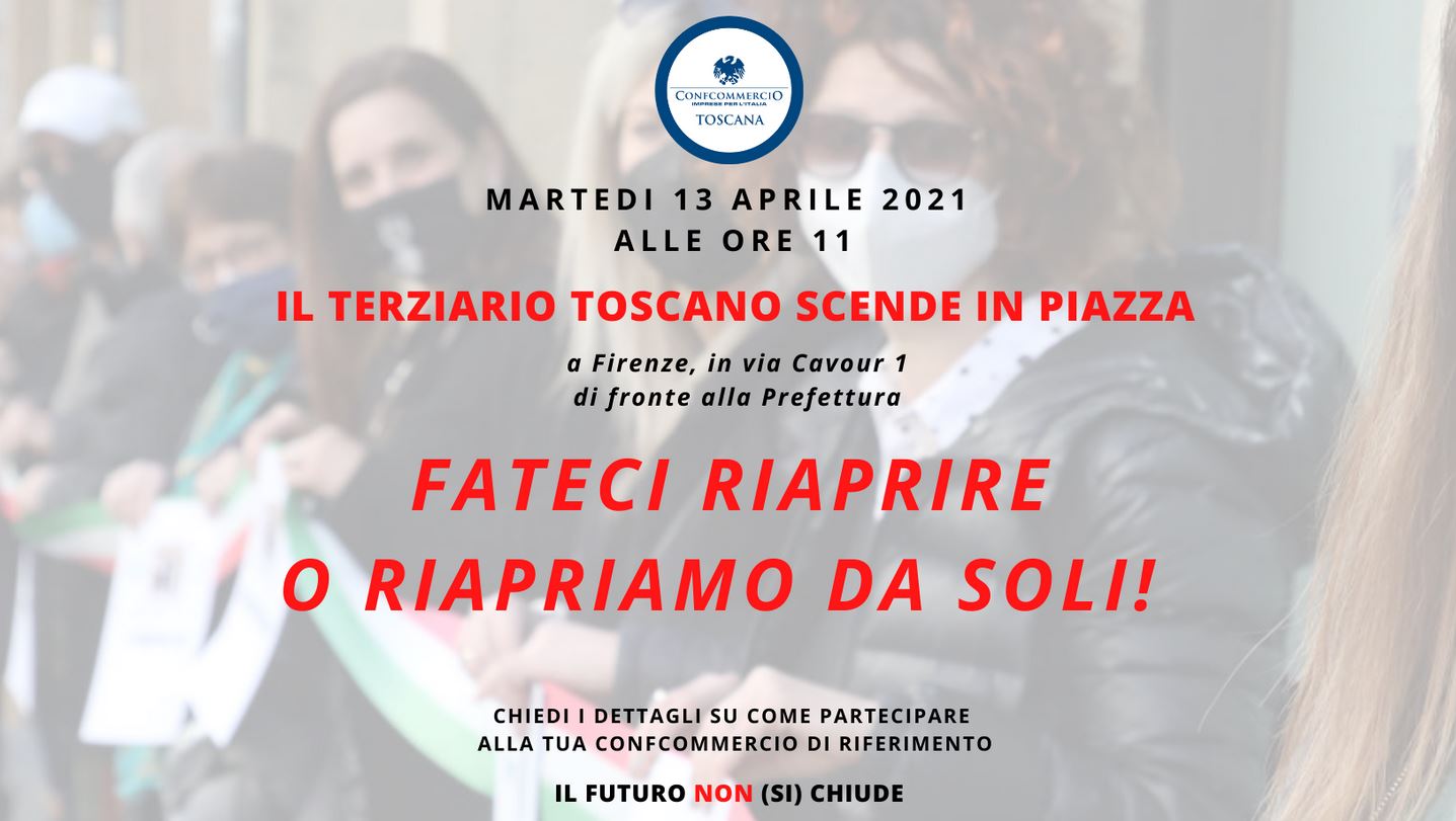 📍 a Firenze in via Cavour 1, davanti alla Prefettura manifestiamo insieme per chiedere una data per la riapertura delle attività del commercio, del turismo e dei servizi. Saremo ricevuti dal Prefetto, al quale consegneremo la nostra richiesta affinché la trasmetta al Governo.
