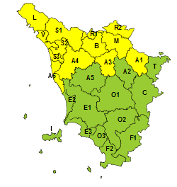 In base al bollettino emesso dalla sala operativa della Protezione civile regionale, le province interessate dal codice giallo sono quelle di Arezzo, Firenze, Livorno, Lucca Massa-Carrara, Pisa, Pistoia e Prato dove sono possibili temporali, anche forti, ma localizzati.