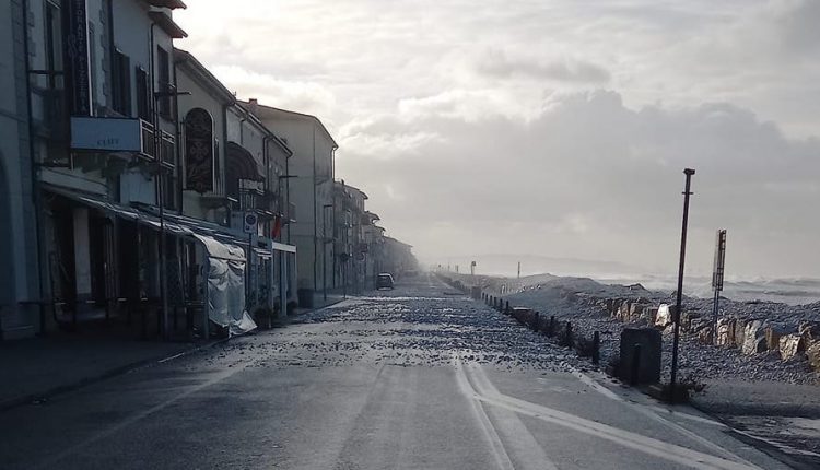 Questa mattina si è abbattuta su Marina di Pisa una forte mareggiata e raffiche di vento che hanno spinto la ghiaie della spiaggia per le strade. Un tratto del lungomare è stato chiuso al sole in quanto raggiunto dalle onde.