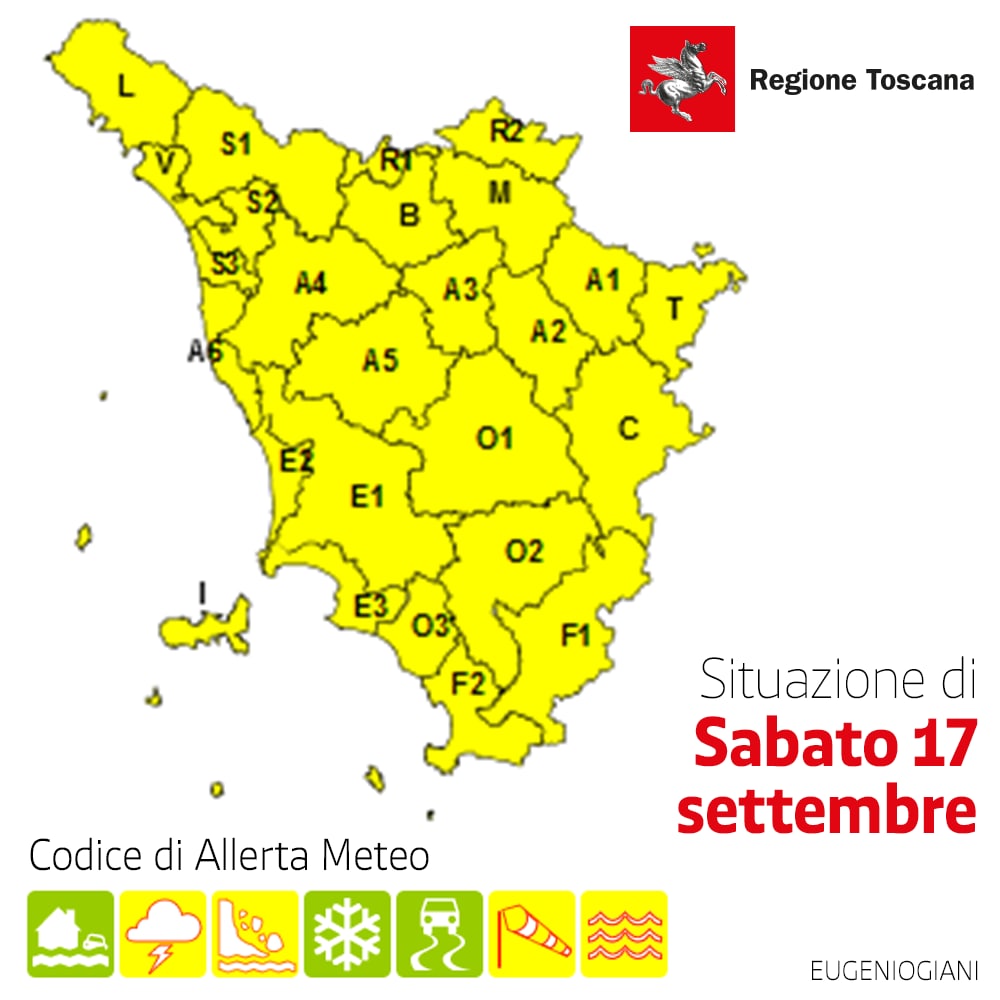 “Emessa allerta di codice giallo per forte vento, temporali e rischio idrogeologico su tutta la Toscana per la giornata di domani sabato 17.
