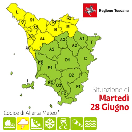 Emessa allerta gialla dalla sala regionale per rischio temporali nella giornata di domani Martedì 28 Giugno per la parte nord della Toscana, prestiamo attenzione.”