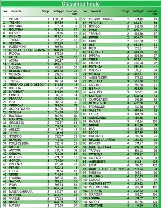 Prima in classifica Parma, che con un salto di ben 39 posizioni si piazza in cima alla classifica, seguita dalle solite Bolzano e Trento.