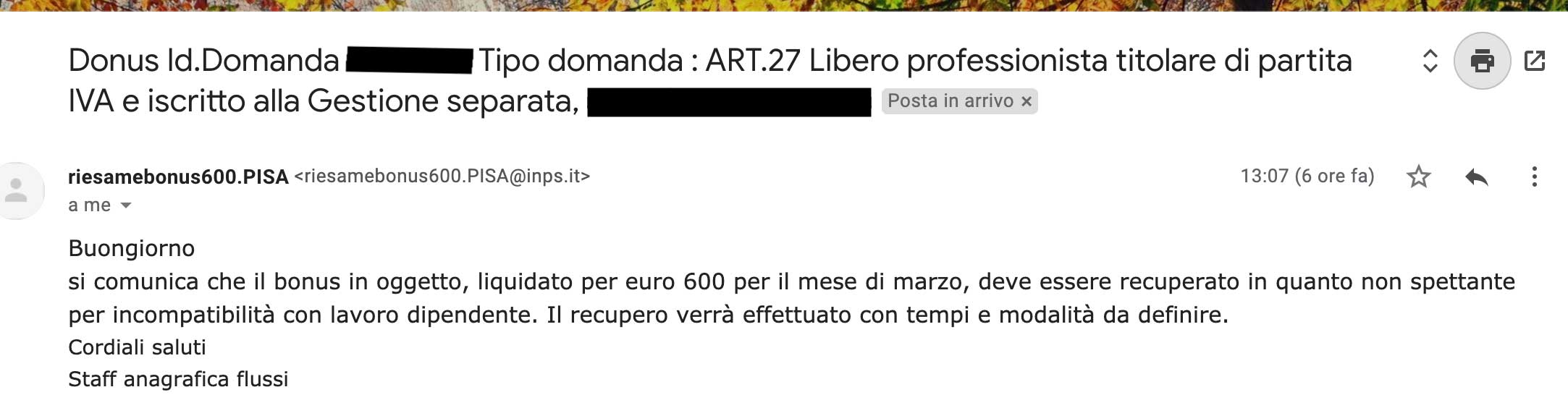 “Vorrei raccontare, a quanta più gente possibile, quanto mi è successo oggi. L’INPS mi ha notificato con una mail che dovrò restituire i 600€ che ho ricevuto a marzo come indennizzo in quanto sono un libero professionista. I famosi 600€ del CURA ITALIA. Quello che hanno preso i deputati quest’estate per intenderci.