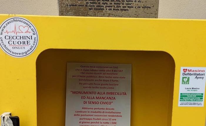 Si tratta dell’ennesimo furto ai danni dei dispositivi DAE posizionati in diversi punti della città dalla Cecchini Cuore Onlus che troppo spesso, purtroppo, sono vittime di atti vandalici stupidi e senza alcun senso.