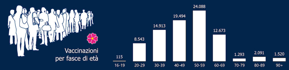 La fascia d’età più vaccinata, su base nazionale, è la fascia dai 50 ai 59 anni con 24.007 dosi somministrate. Stesso dato vale per la Toscana
