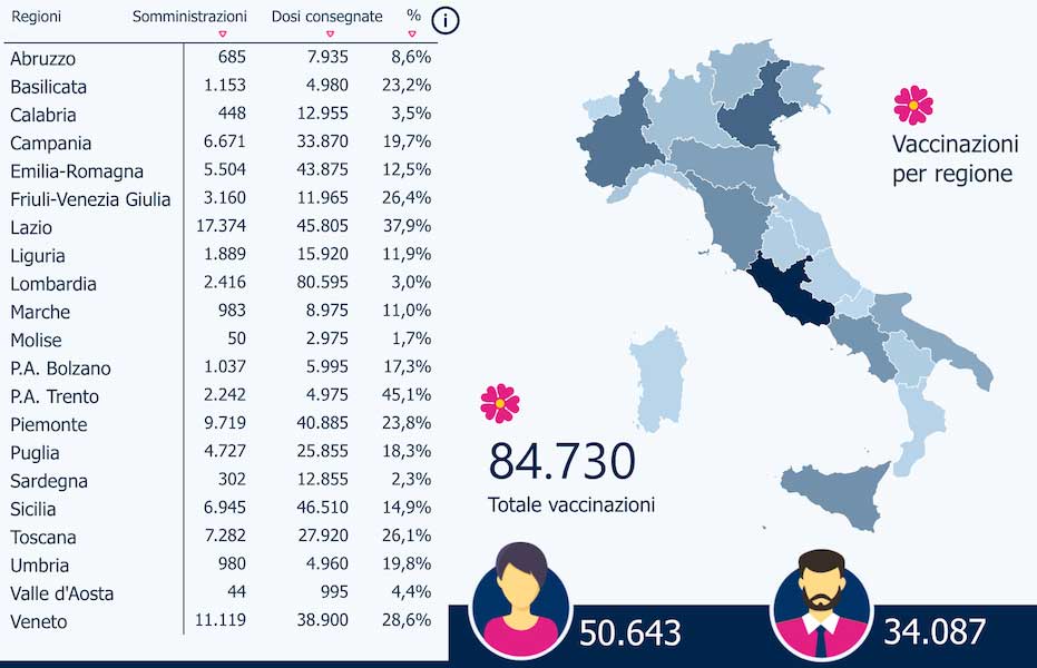 La regione con la più alta percentuale di vaccinazioni e il Lazio con 17.374 dosi somministrate su 45.805 vaccini ricevuti (37,9%).