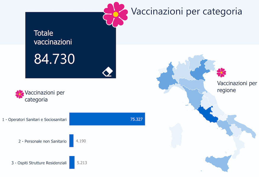 Le dosi di vaccino sono ad oggi destinate solo a personale ospedaliero e delle RSA, oltre agli ospiti di queste ultime. Al livello nazionale sono state somministrate:
